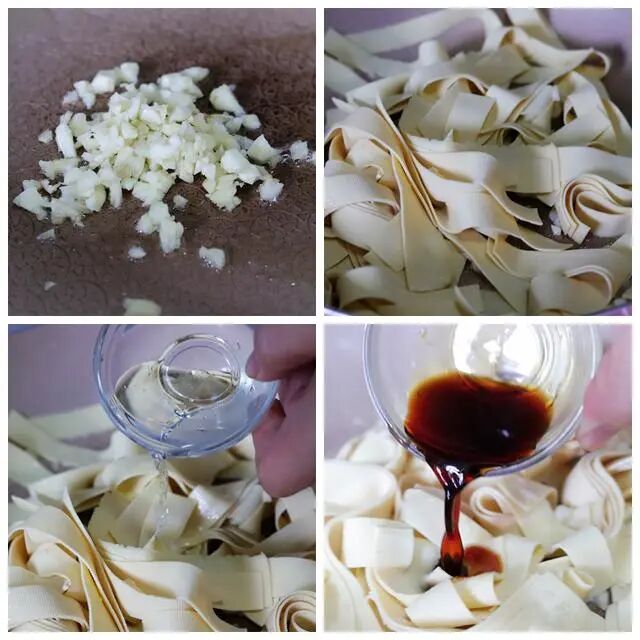 2、锅中放十五克油,切碎的蒜瓣炒香。将豆腐皮放进锅中翻炒,加入一百毫升的清水,煮上两三分钟,浇入十五克生抽,加入五克蚝油。