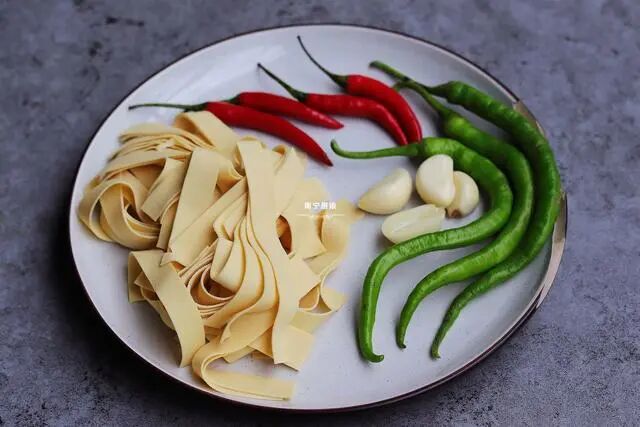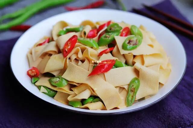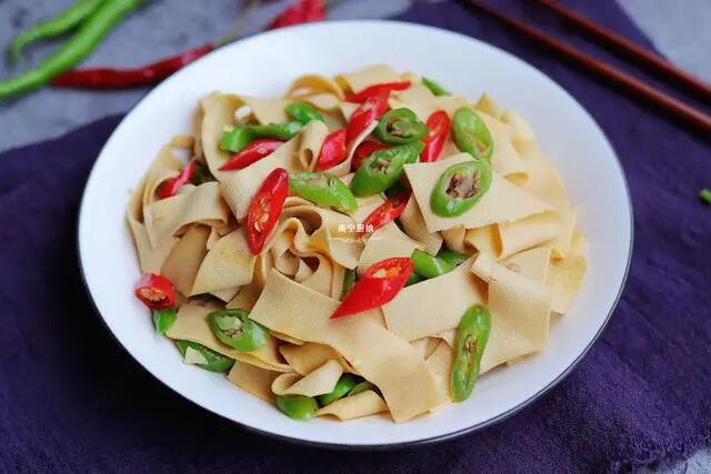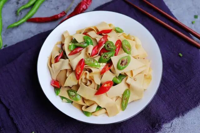 豆腐皮里加几颗辣椒,下锅简单一炒,开胃下饭,吃起来比肉还过瘾