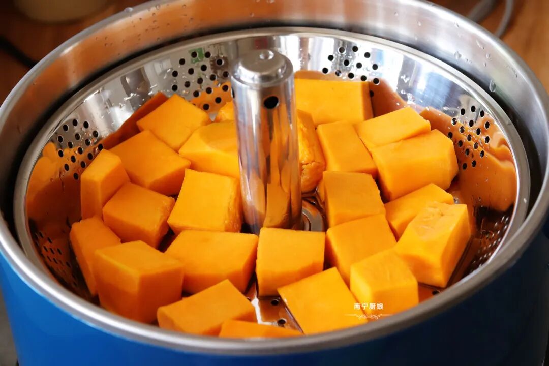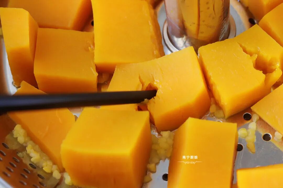 把南瓜蒸熟之后,南瓜当中的水分也会较少,那么留在南瓜当中的糖分就会比较高,这个时候再用南瓜和小米搅拌在一起,就可以给小米增添天然的糖分,所以这么做出来的南瓜小米粥也不需要再额外加糖。