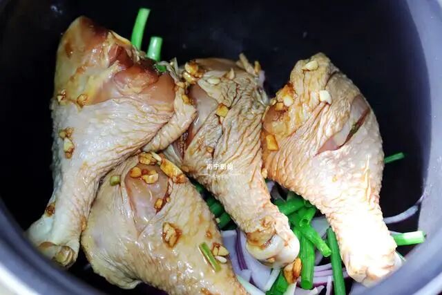 2、把香葱段和洋葱丝铺在电饭锅底,然后把腌制好的鸡腿放入电饭锅中,按下电饭锅的煮饭模式。在煲煮的过程中,为了安全起见,可以在煮的过程中检查一下,鸡腿有没有烧焦,适当地挪动翻面也是可以的,之后就等时间到了就可以吃了。