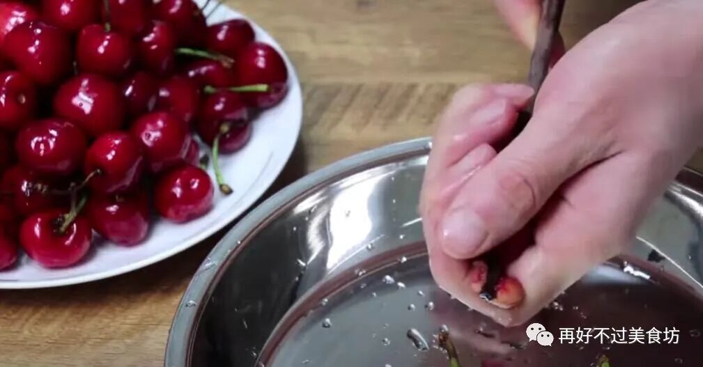 首先准备一根筷子,然后将粗的那一面筷子,正对着樱桃的底部正中央的位置,接着微微一用力,就能看到果核被捅了出来,一点果肉也不带。