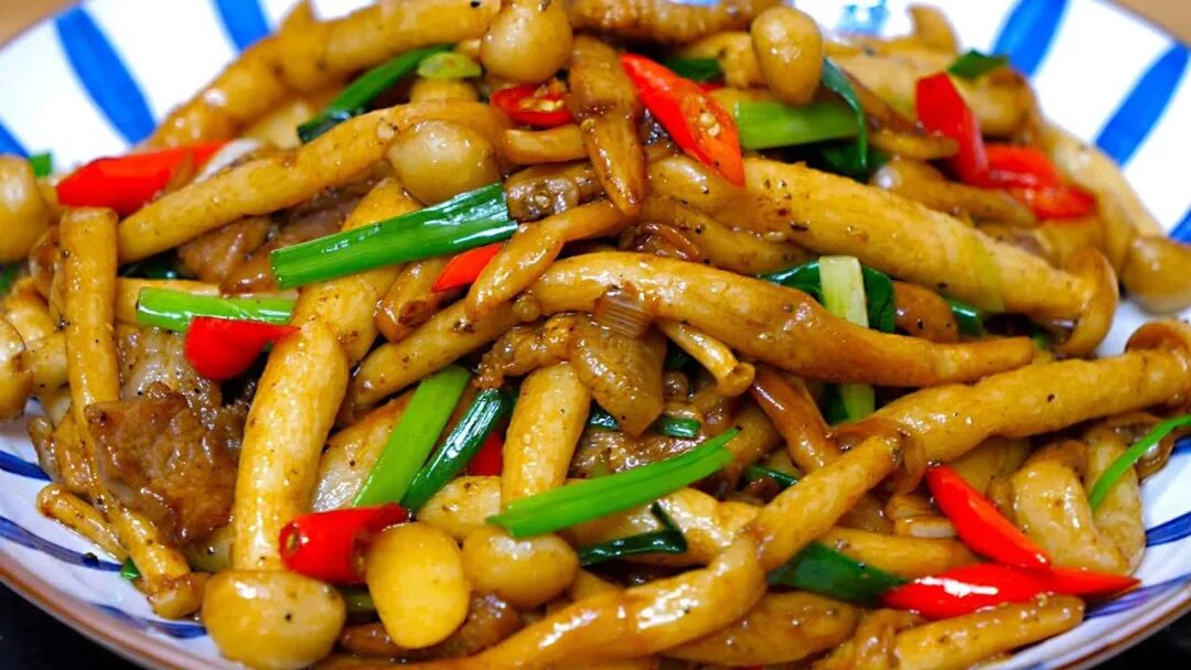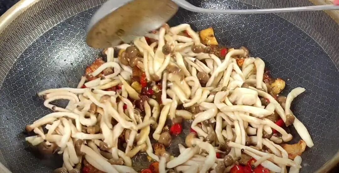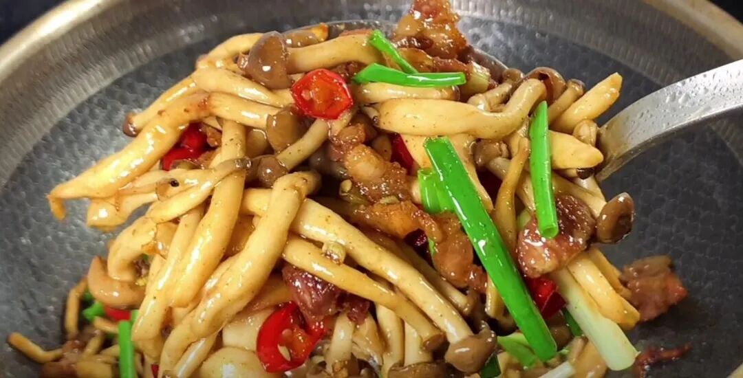 8、蘑菇吃起来非常的嫩滑爽口,嚼起来又脆又香,五花肉油脂全部爆出来了,吃起来一点都不油腻,喜欢的朋友可以在家里面试一试。