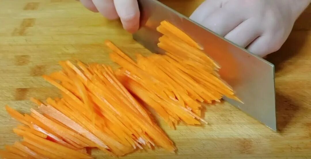 1、准备一根洗净的胡萝卜,先去掉根蒂和外皮,然后切成薄片,再切成丝,切好的胡萝卜丝先装入盘中备用。