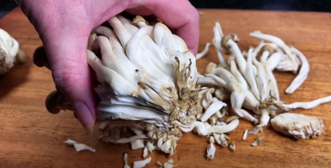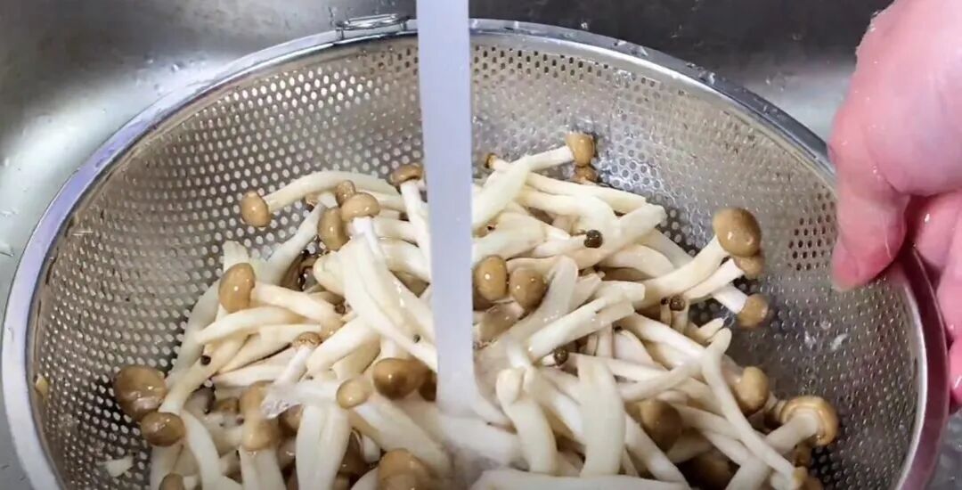 1、先剪去蘑菇的根部,全部剪好之后将它放在漏勺中,用手将它捏散,随后用流动的清水把蘑菇清洗干净。