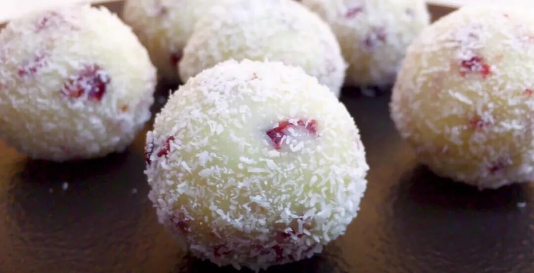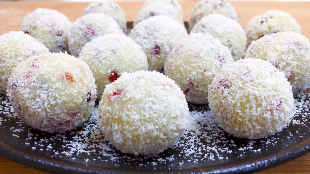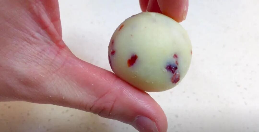 4、我们下手把它和成团,就放一旁留着备用,然后拿一小把蔓越莓干把它切碎,再放到山药团里,把它揉进去,再加一小块团成团,最后沾上一层椰蓉。