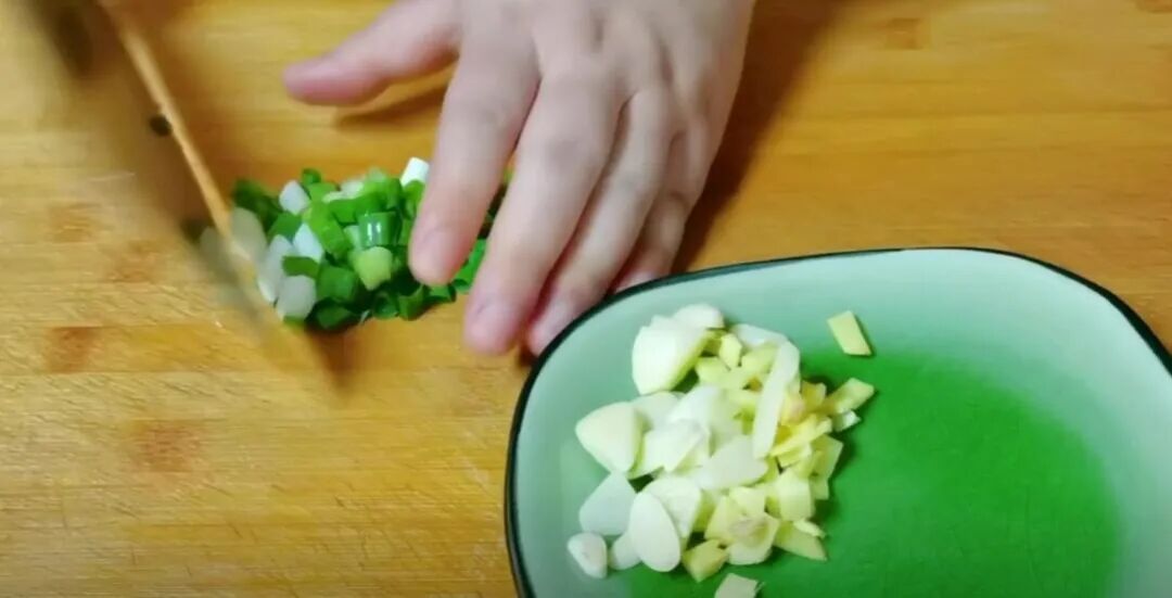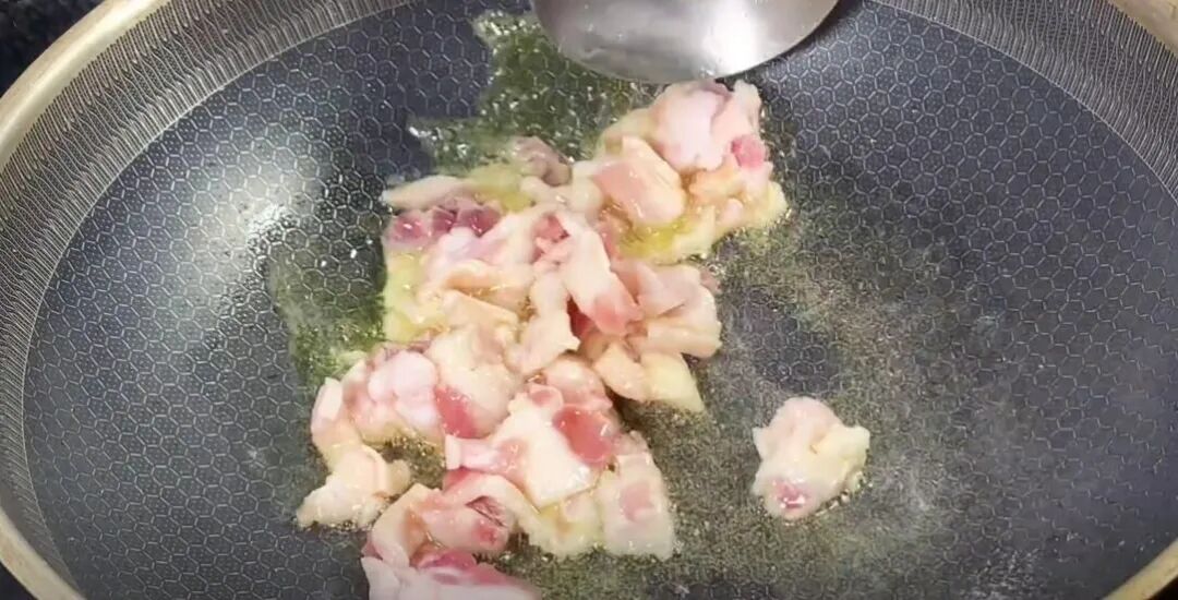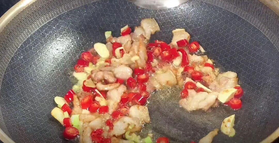 4、接下来起锅烧油,油热后,把五花肉倒下去炒香,炒到五花肉的表面微微发黄,就把葱蒜倒下去炒,要是锅里油比较多,我们就用勺子舀出来,这样吃起来也不会油腻。