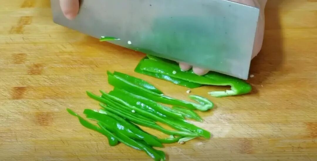 2、再准备两个洗净的青椒,先去掉根蒂,再把籽和茎给它去除干净,然后再切成丝,这里的辣椒要选不辣的青椒来制作,切好后和胡萝卜丝放一起备用。