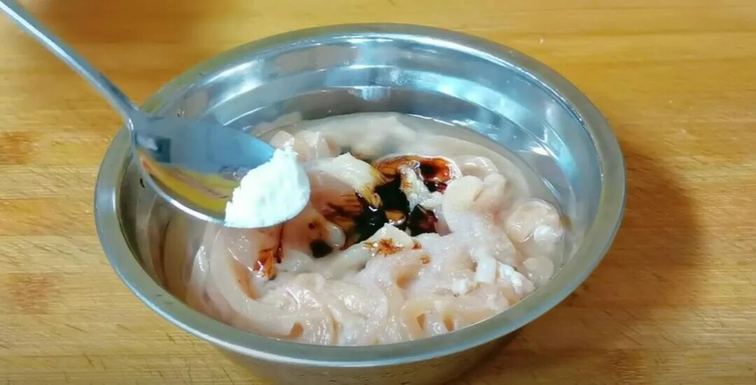 5、下一步开始腌制,先在里面加入两勺的料酒去腥,再加入少许的盐增加底味,再加入少许的老抽略微上色,加入适量的淀粉,增加滑嫩的口感。