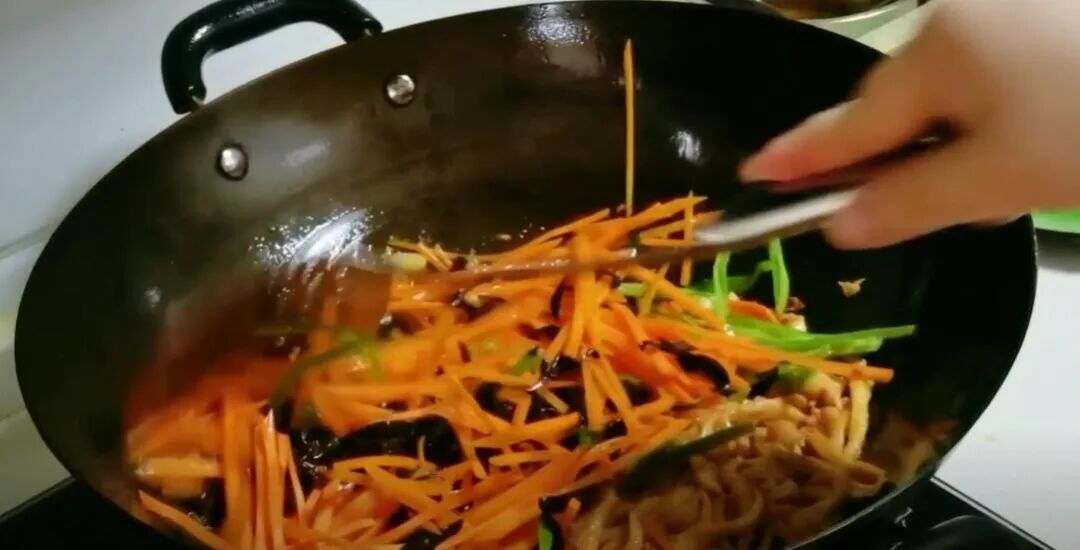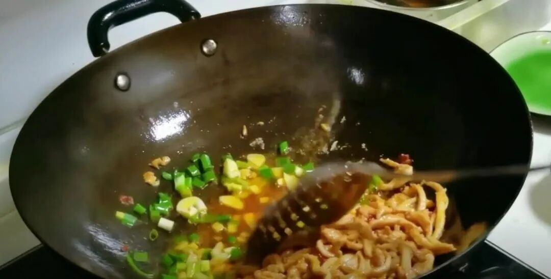 9、等鸡肉丝在被炒到表面略微变白,就倒入切好的葱姜蒜在锅中一起煸炒,充分的炒香后,再把胡萝卜丝,木耳丝和青椒丝倒入锅中一起煸炒。