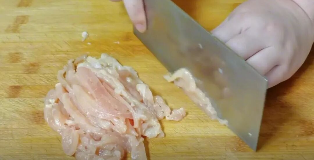 4、接下来再准备一块鸡脯肉,鸡脯肉的脂肪含量比较低,而且口感比较滑嫩,吃起来会更加的营养健康,先把鸡脯肉给它片成均匀的薄片,然后再切成鸡肉丝。