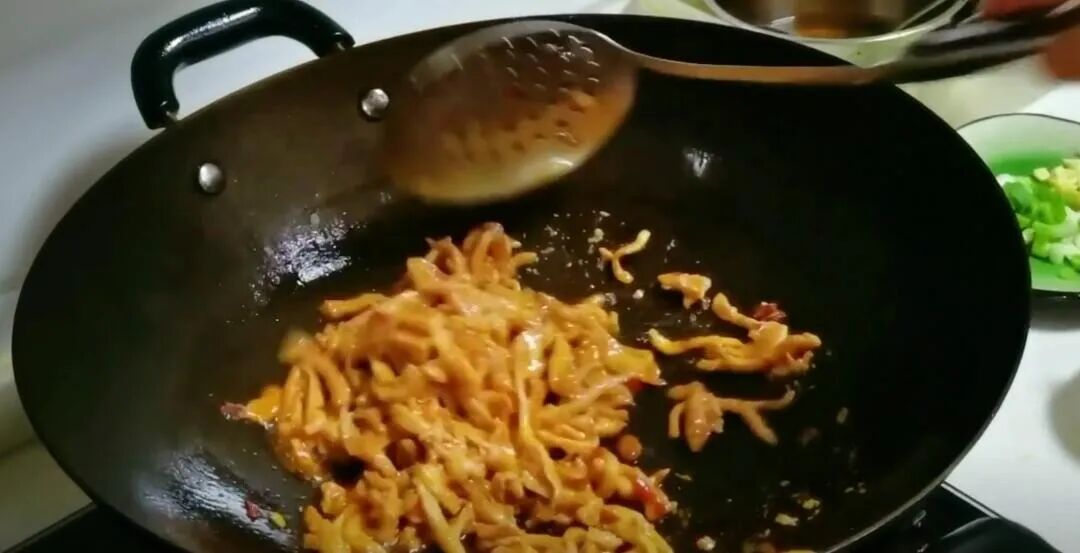 8、接下来把锅充分烧热后,加入适量的油,不用等油温升高,直接倒入肉丝在锅中快速的滑炒,这样在炒制的过程中就不容易粘锅。