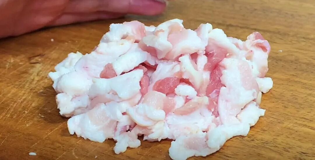 2、准备一小块五花肉,用刀切成薄片,随后准备一小段大葱、几粒大蒜,几根小葱和四根红椒,将其全部切好之后,就装在碗里备用。