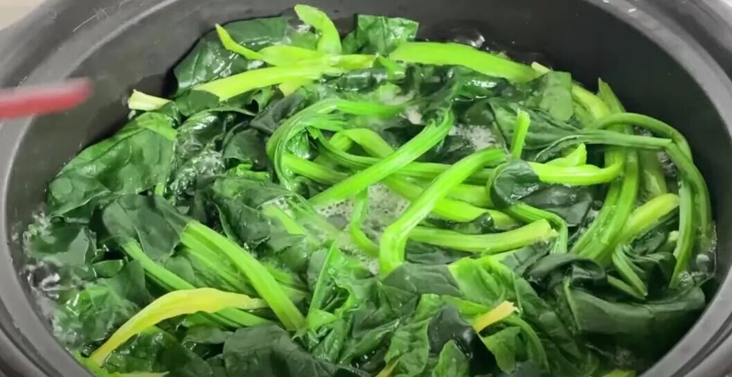 1、买来的菠菜去除老根,洗净,放在开水锅中焯一下水,等水再次沸腾起来,焯好的菠菜颜色更加翠绿了,捞到盆中过一下凉水。