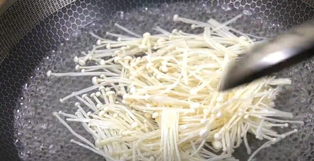 4、锅里水烧开,倒入金针菇焯水,去掉草酸和腥味,水再次开后捞起备用。