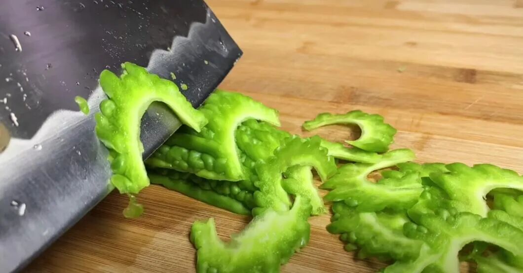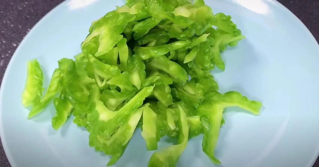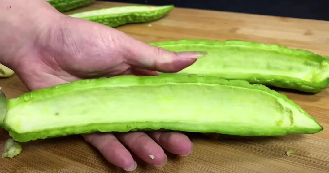 1、用刀将苦瓜对半切开,并勺子把瓜瓤刮干净,接着把苦瓜切去头尾,再斜刀将苦瓜切成薄片,这样方便把苦味全释放出来。