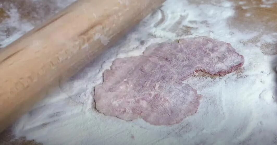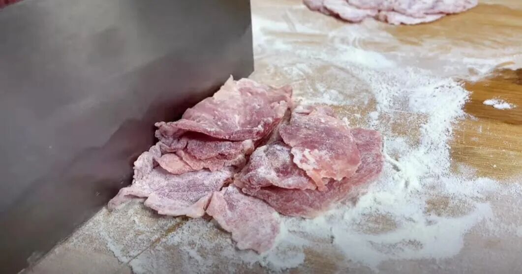 4、接下来,往砧板上撒上一些面粉,将切好的肉片放在面粉上,让肉片全部沾满面粉,然后用一根擀面杖把肉捶扁,这样吃起来就会很嫩滑。