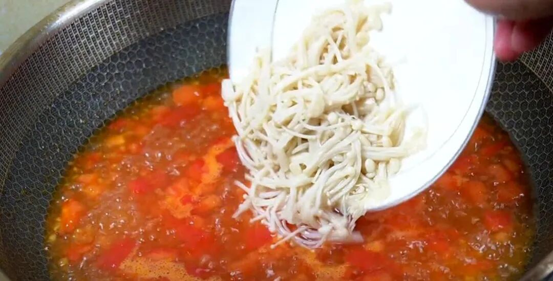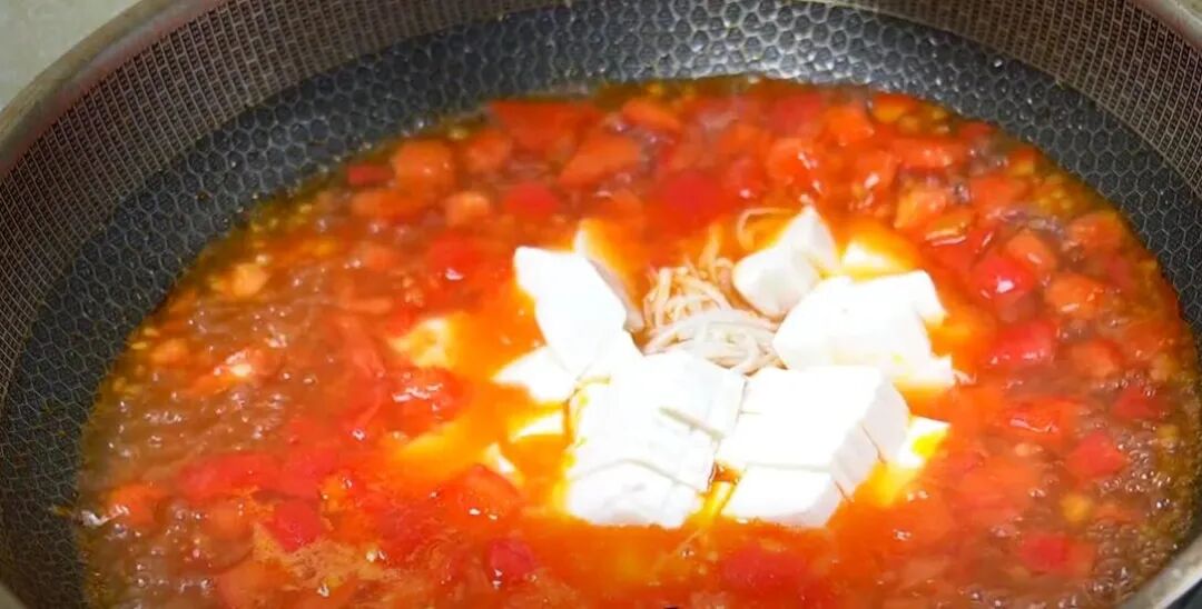 5、热锅放油,倒入西红柿丁,中火将西红柿炒至出汁,然后倒入清水,煮开后下入金针菇、豆腐。