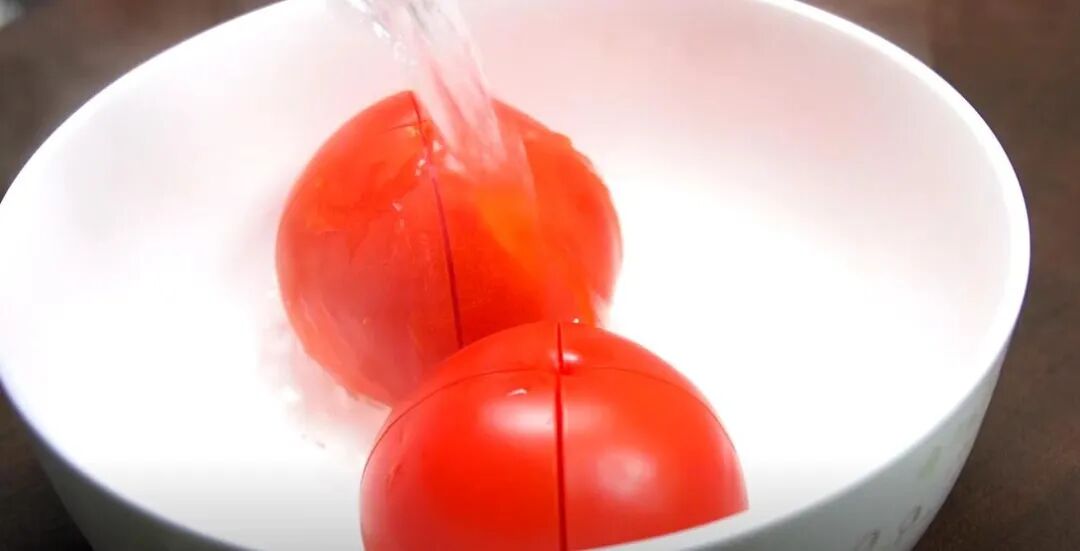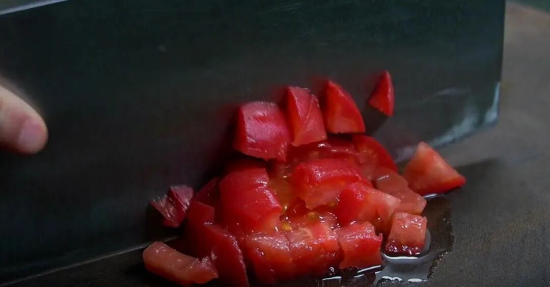 2、在番茄表面切十字花刀,并用开水烫几分钟,撕掉外皮,从中间斜刀切开,去掉中间的西红柿的,然后改刀切成丁。