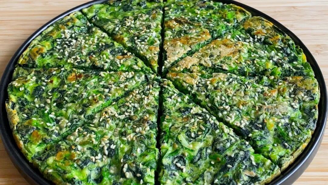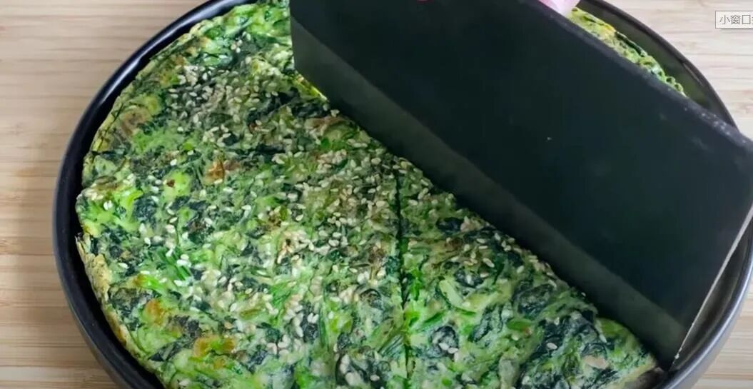 8、这个菠菜鸡蛋饼的颜色很漂亮,用刀切成一块块的,这样方便食用,好吃又营养,大家喜欢赶快试试吧。