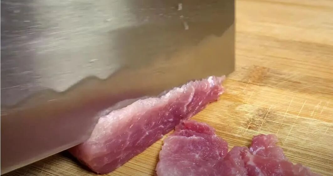 5、等所有肉片都捶成像纸一样薄,然后把它放在砧板上,改刀切成小块。
