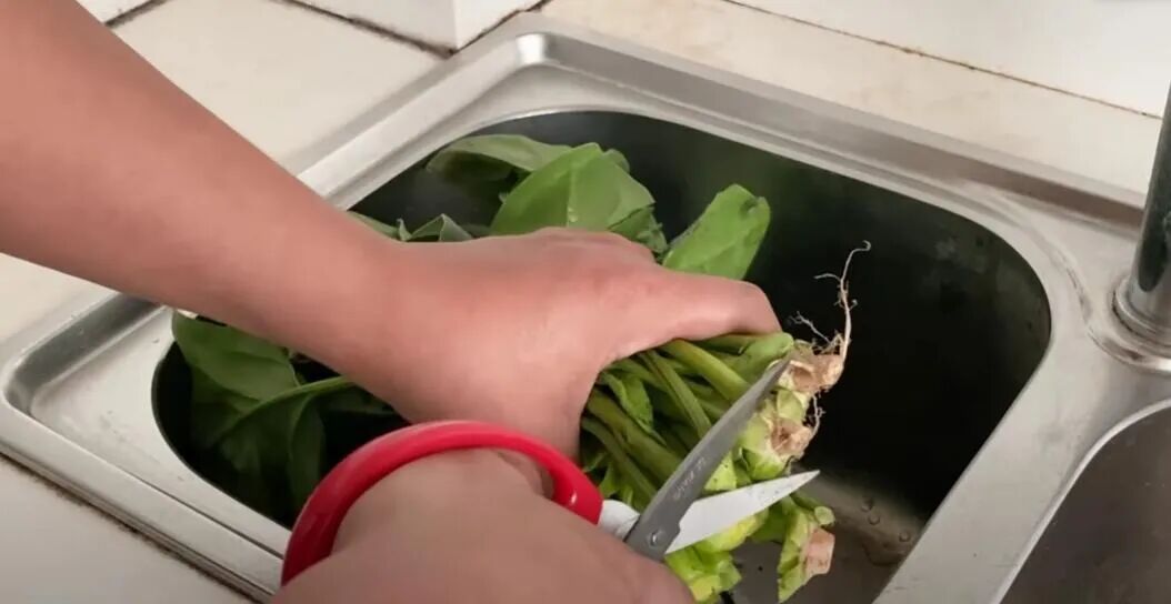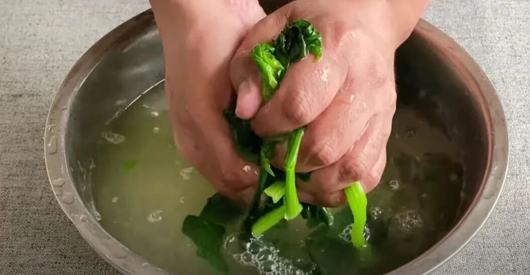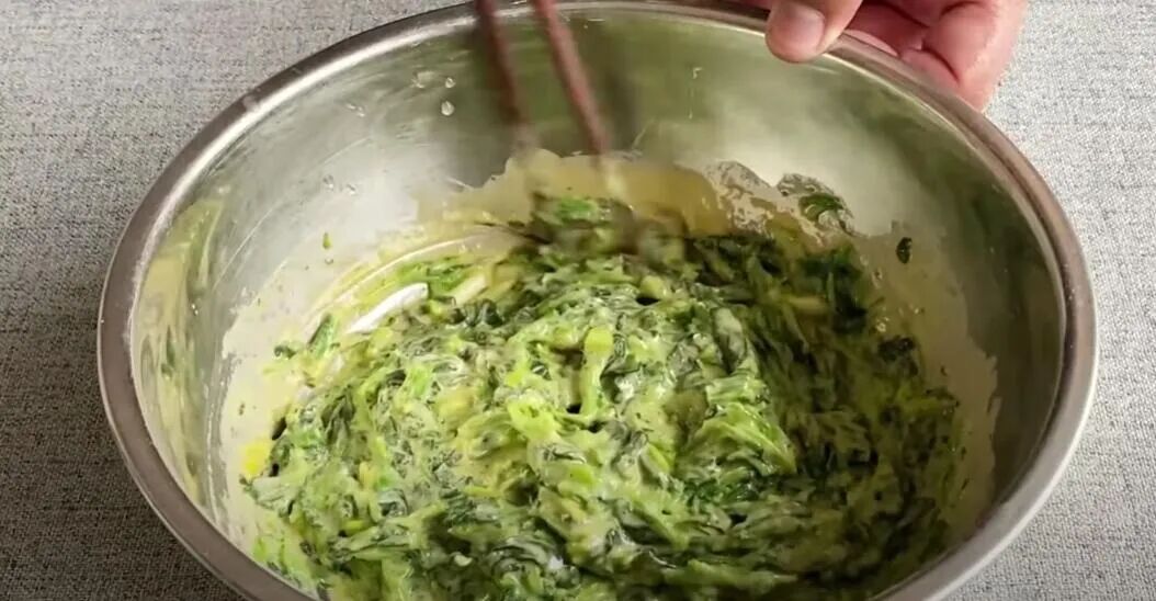 4、将焯过水的菠菜拿在手掌中,使劲按压一下,把水分控干后,再用刀切碎,然后将菠菜扔进面粉糊糊里,拿出一双筷子快速搅拌均匀。