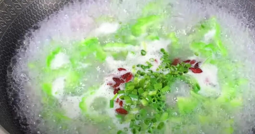 11、紧接着把苦瓜倒下来,继续开大火将苦瓜煮开,然后加入一点枸杞,再下入葱花,用勺子翻炒均匀,一道汤鲜肉嫩的苦瓜汤就做好了。