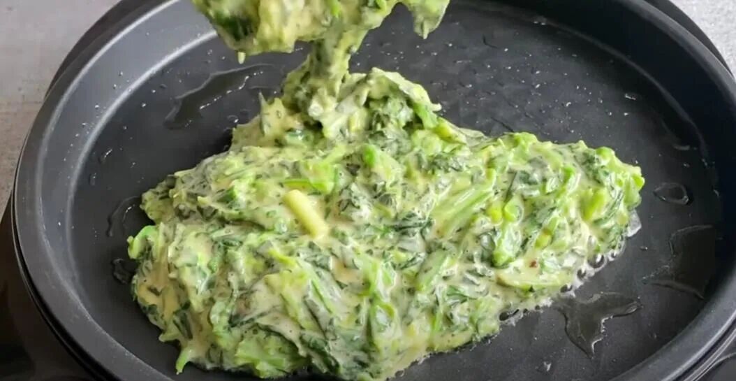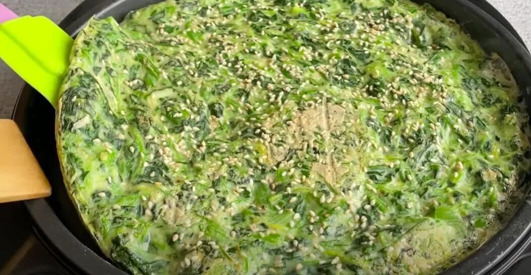 5、电饼铛预热,刷上少许食用油,倒入全部的菠菜糊,就用铲子迅速摊平,摊均匀,要中小火烙,火大了菜就糊了,撒点白芝麻,增加香气。