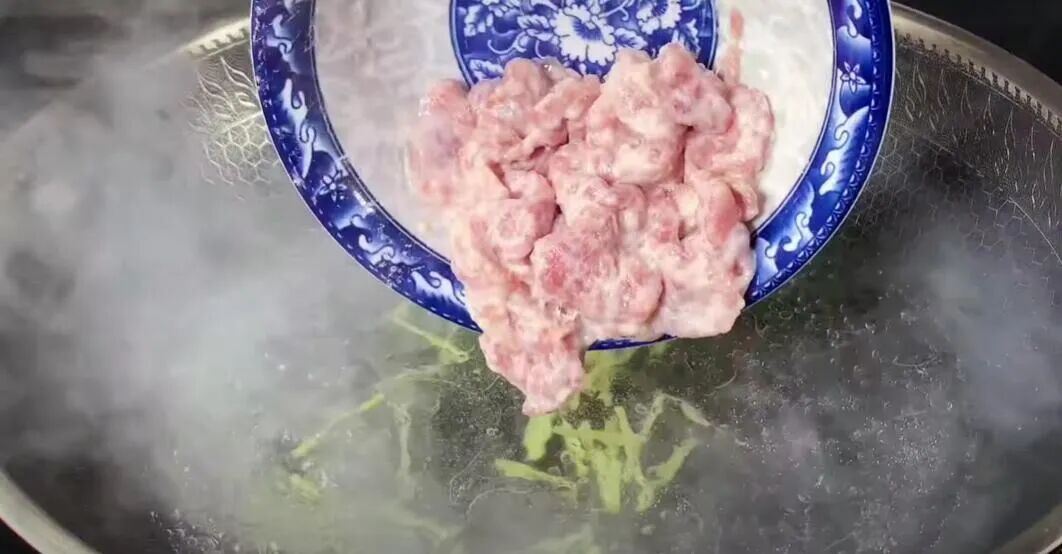 9、接下来等油热之后倒入清水,开大火将其煮开,把切好的姜丝倒进来,水开之后倒下肉片,用筷子将肉划散,让其受热均匀,用开水煮出来的肉片才不会变柴。