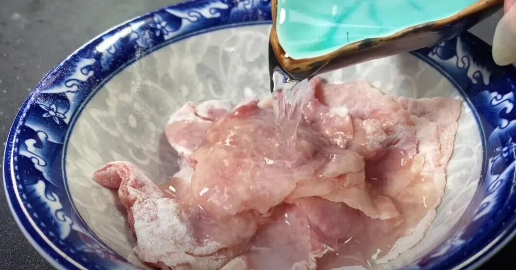 6、之后把它放在碗中,加入食盐和清水,用手抓拌均匀,给肉片上浆,这样吃起来会更加的滑嫩。