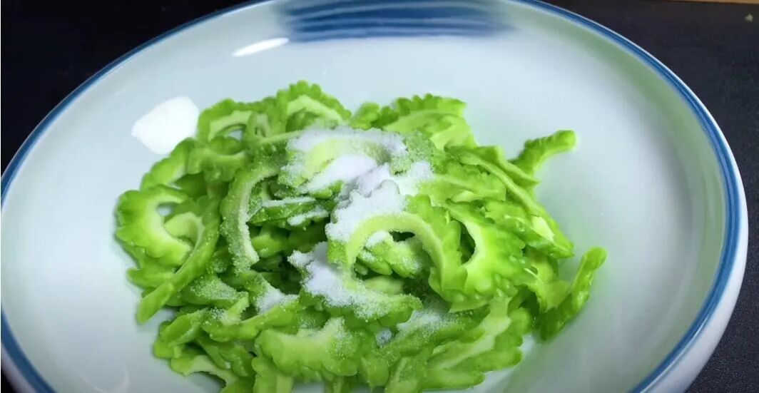 2、全部切好后,放在一个碗中,并加入一勺食用盐,倒入适量的山泉水,没过苦瓜,将苦瓜用盐水浸泡十分钟,这才是苦瓜不苦的关键。