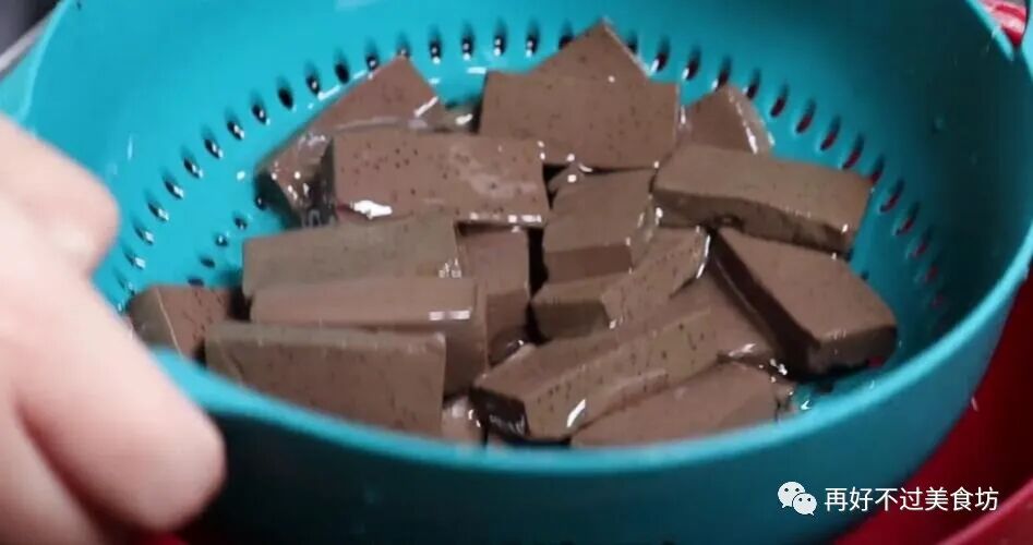 这是因为羊血焯水后,表面会有很多浮沫,需要给它清洗干净,之后控水放一旁备用。