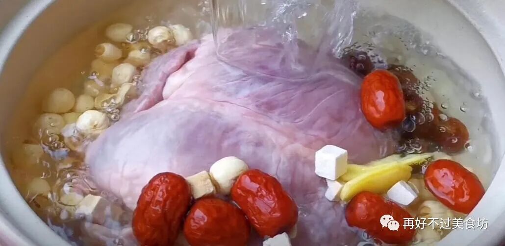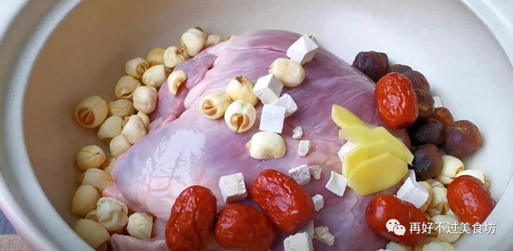 4、将猪心、龙眼肉、红枣、莲子和姜,全部放入砂锅中,并倒入一勺黄酒去腥增香,再倒入适量的温水没过猪心。