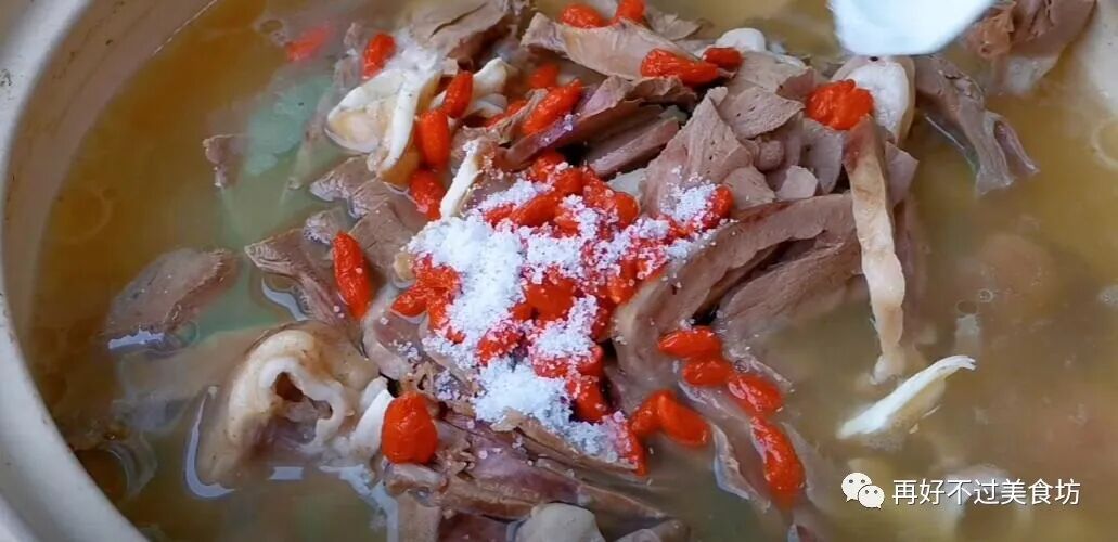 6、切好后,将猪心重新放入砂锅中,并加一把枸杞进去,还有适量的食盐进行调味,搅拌均匀再煮几分钟,即可食用了。