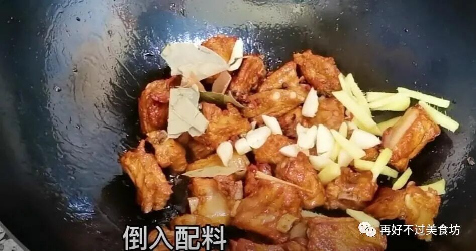 接着翻炒上色,倒入姜丝、蒜末、花椒、桂皮和香叶,翻炒出香味后,倒入大量的清水,直到淹没排骨为止。