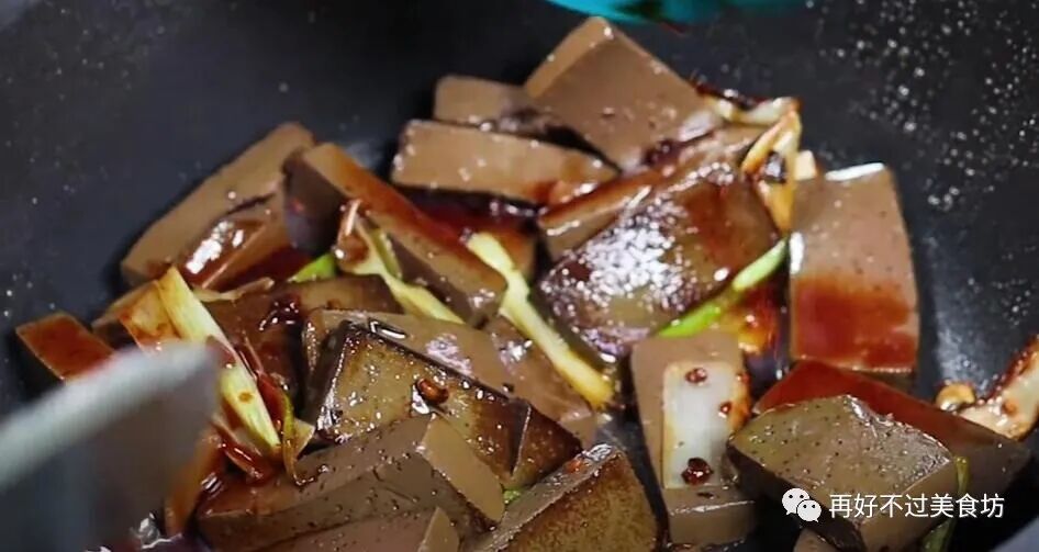 做葱烧羊血,大家要记住一点,那就是必须要把大葱给炒软了,再放羊血。