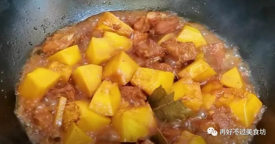 4、1个小时之后,倒入切好的南瓜块,豆瓣酱、白砂糖,用铲子翻炒均匀,再煮5分钟左右,就开始大火收汁,出锅前撒点葱花上去,这道南瓜烧排骨,就做好了。