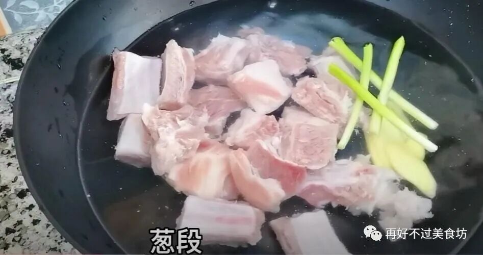 1、将洗干净的排骨放锅里,并加入适量的清水、姜片、葱段,焯水5分钟,然后放冷水里,把表面的浮沫给洗干净,沥干水分留着备用。