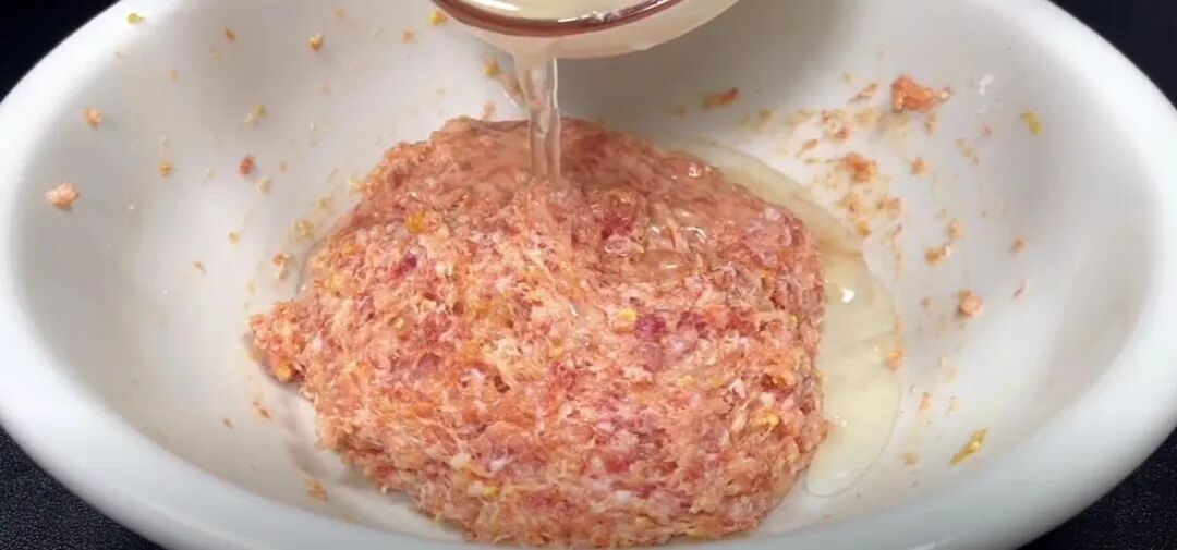 6、加入葱姜水是为了去腥增香,这样吃起来的口感也会更加滑嫩,一直搅拌到肉馅,把葱姜水都吸收进去就可以了。