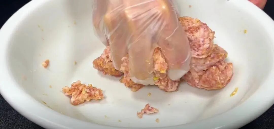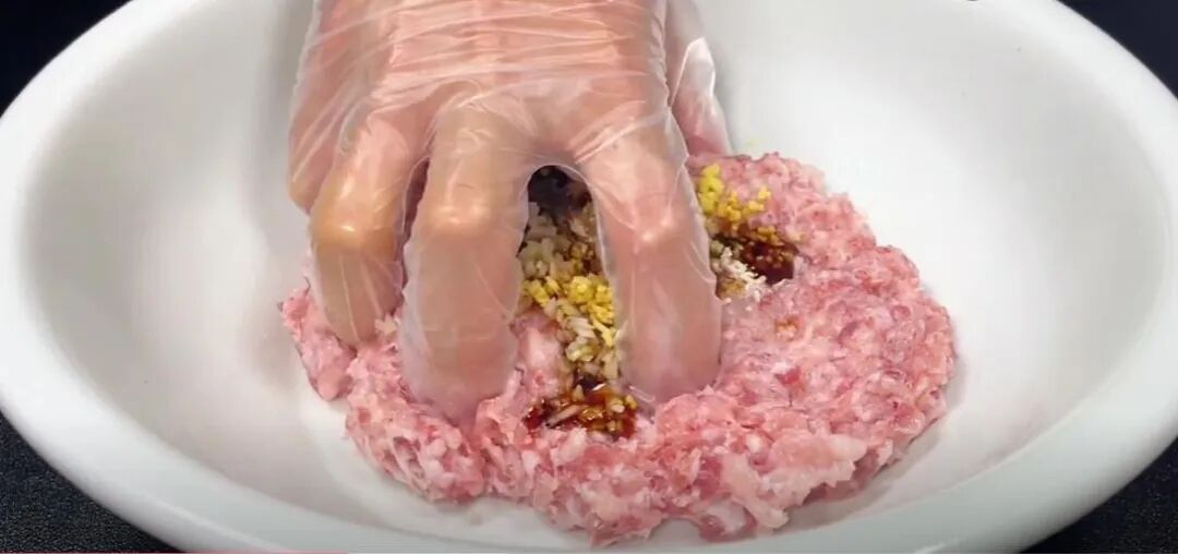 5、抓拌均匀后,再把肉馅摔打一下,让肉充分的上劲,摔打上劲后,再往肉馅里面加入一些葱姜水,然后朝一个方向搅拌,让肉馅充分的吸收葱姜水。
