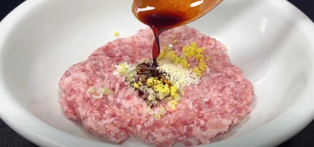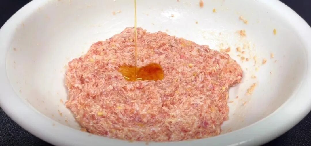7、最后加入少许的香油,再次搅拌均匀,这样我们的肉馅就调好了,先把它放一旁备用。