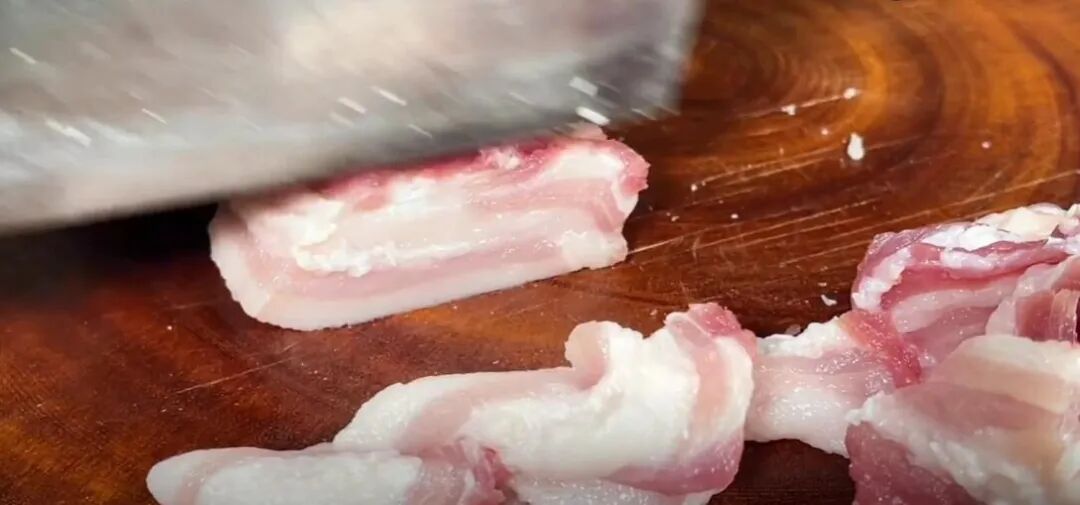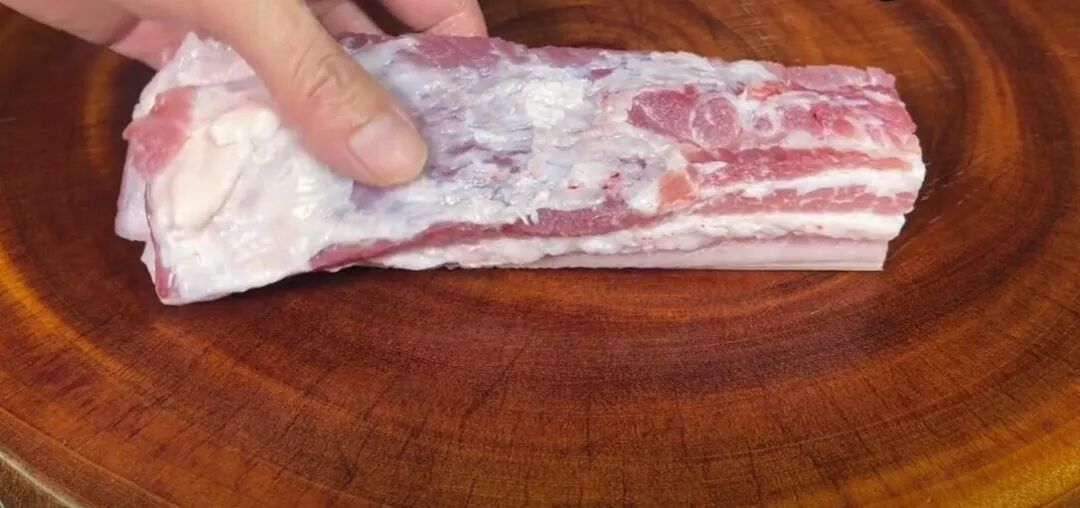 1、首先准备一块带皮的五花三层,咱们先来把猪皮给它片下来,因为猪皮比较硬,吃起来的口感不好,然后改刀切成薄片。