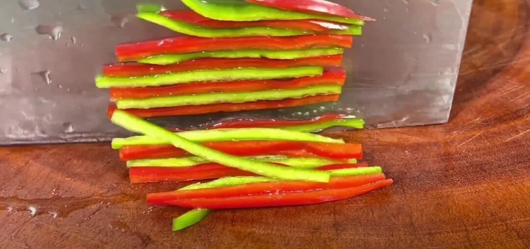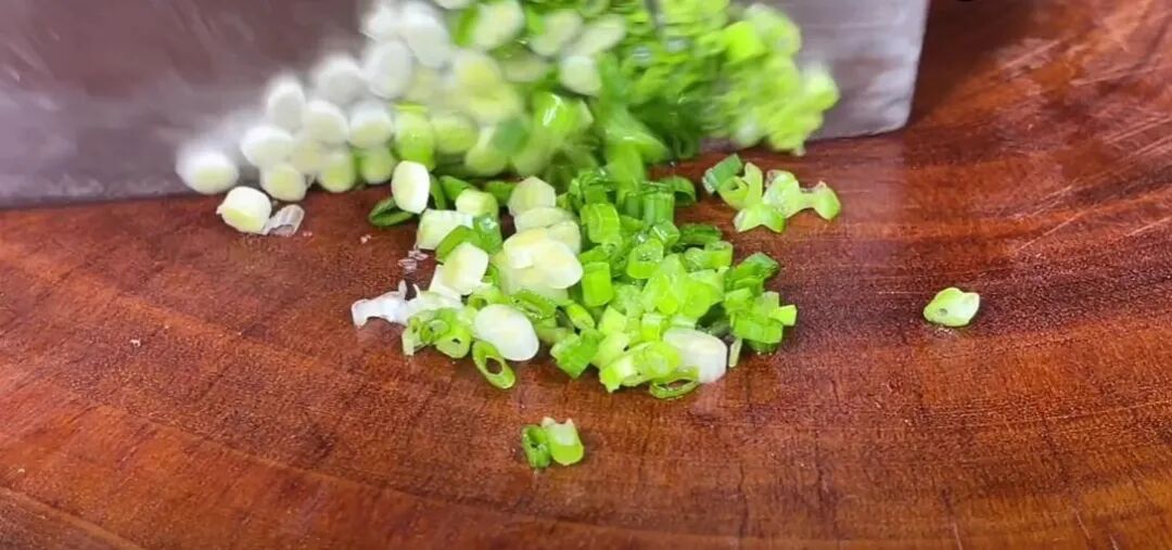 12、趁这个时间,来切一点配料,准备半个青红椒改刀切成丁,小葱切成葱花。