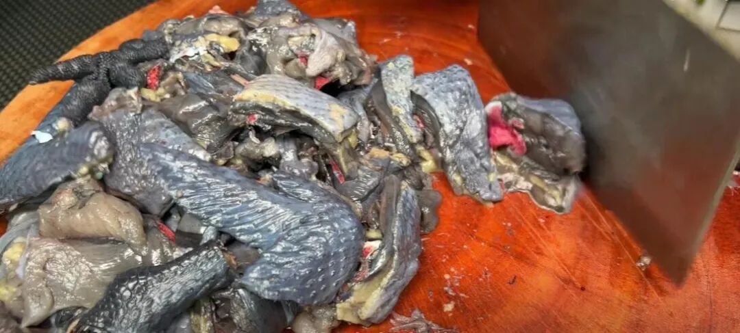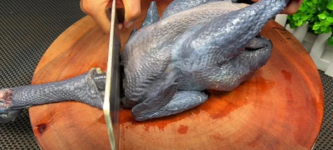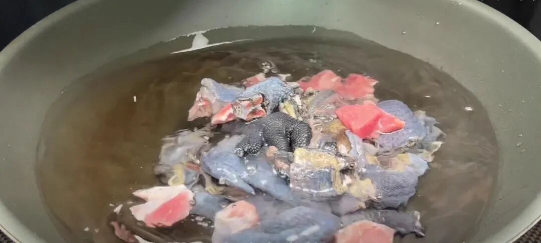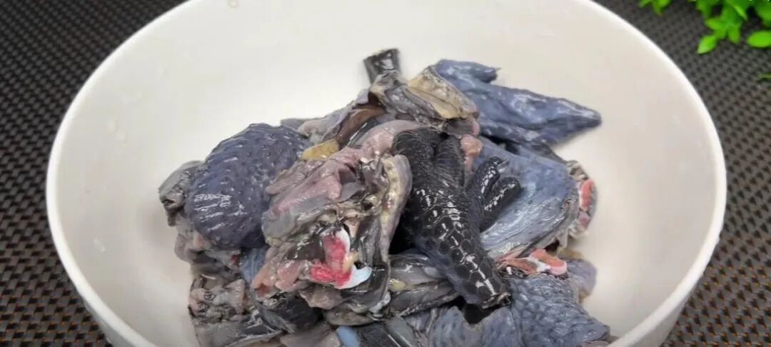 2、还有乌鸡的头含有重金属,是不能煲汤用的,全部剁成小块后放入盆中,加入清水,把乌鸡清洗干净。