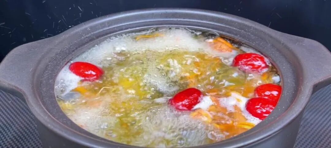 11、俗话说大火煲浓汤,小火煲清汤,这也是广东煲靓汤的口诀,你们看,滚煮了十分钟,这个汤已经变得非常浓郁了。