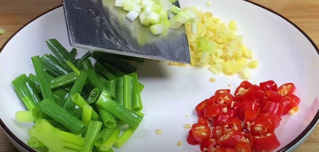 2、接下来切点配料,生姜和大蒜子先用刀拍扁,再剁成姜蒜末,小米椒切成圈,小葱则是切成两半,葱白切成葱粒,葱叶切成小段,切好也放入盘子里面。