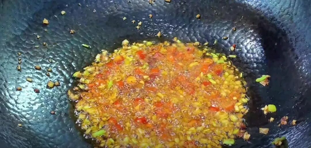 8、接下来往锅中倒入少许食用油,油热后,倒入葱蒜末爆香,小米椒也放下去炒香,再放入少许豆瓣酱,炒出红油。