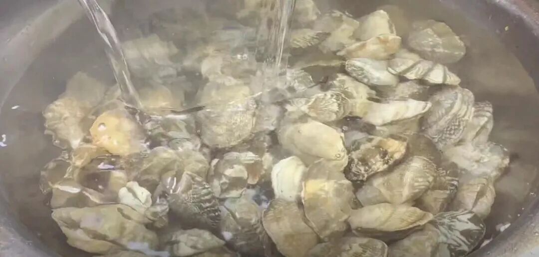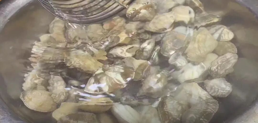 7、等花蛤刚刚要开口的时候,再将其捞出来,我们来看一下,经过这样处理的花蛤,里边已经非常干净了。