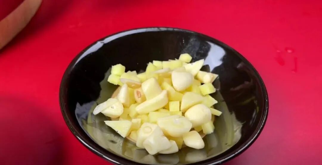 6、再给它切点小米椒,野山椒,再切点生姜,大蒜,切好后给它放入碗中。