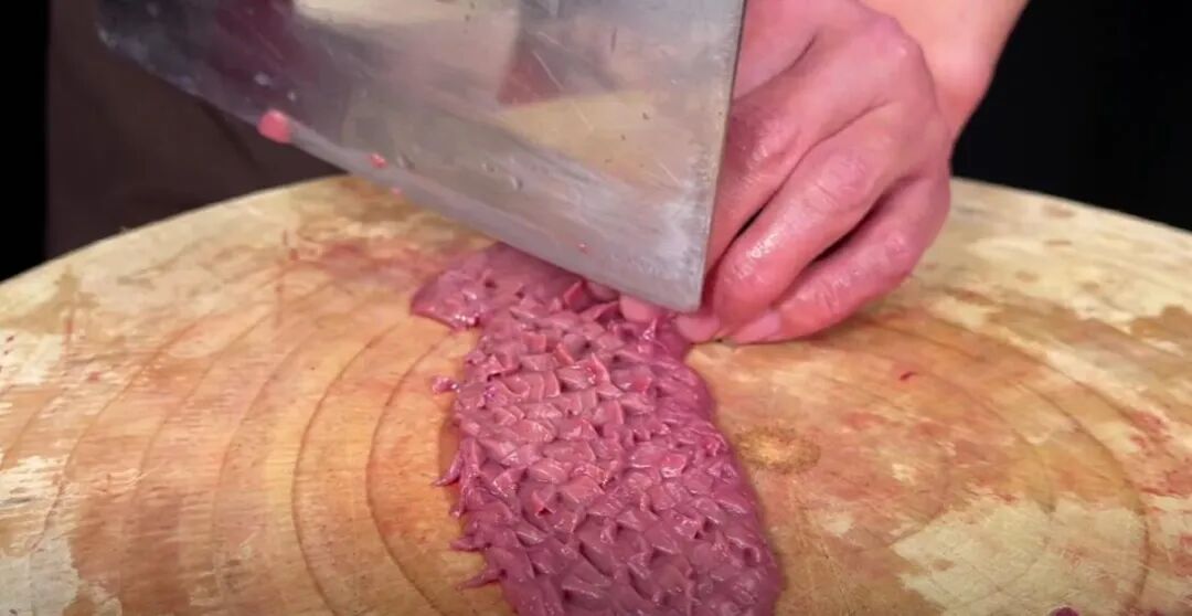 2、下一步开始打上花刀,将刀斜45度角,边切边往回拉,切着腰花升2/3处,注意不要切断,一面打好后,再将另一面改直刀切至第四刀处,中间给它切断。