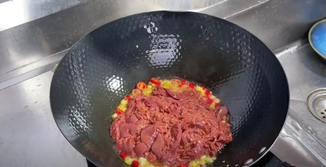 8、锅中油热后,放入小米椒,野山椒,生姜,大蒜给它炒出香味,再将腌制好的腰花下入锅中,开大火给它爆炒。